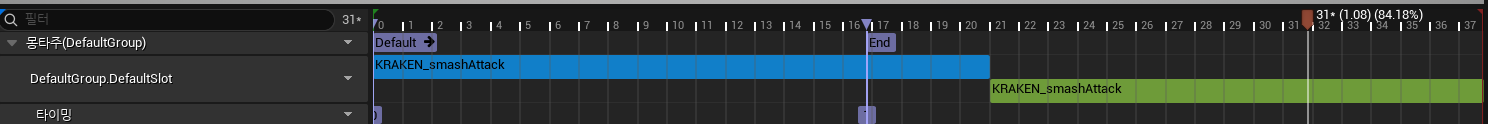 몽타주를 이용해서 어택 애니메이션 앞 부분을 잘라서 사용 두번째는 역재생하여 자연스럽게 이어 붙임