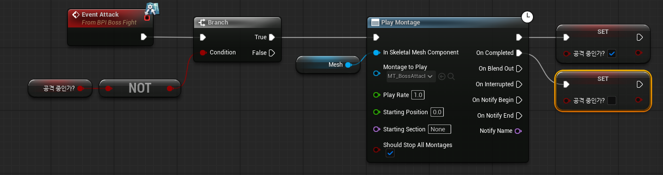 공격에 대한 쿨타임을 따로 설정하지 않고 애니메이션이 다 끝나길 기다릴 시 아래와 같이 설정 해줘야 실행 중이던 애니메이션이 다 재생된다.