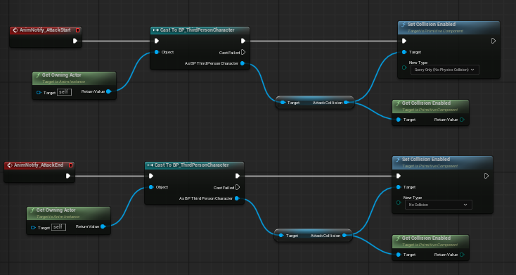 애님 블루프린트에서 몽타주에 설정한 노티파이 통해서 콜라이더를 On/Off 하며 플레이어 BP에서 콜라이더에 오버랩 되는 자신을 제외한 Pawn만 검증해서 대미지를 줍니다.